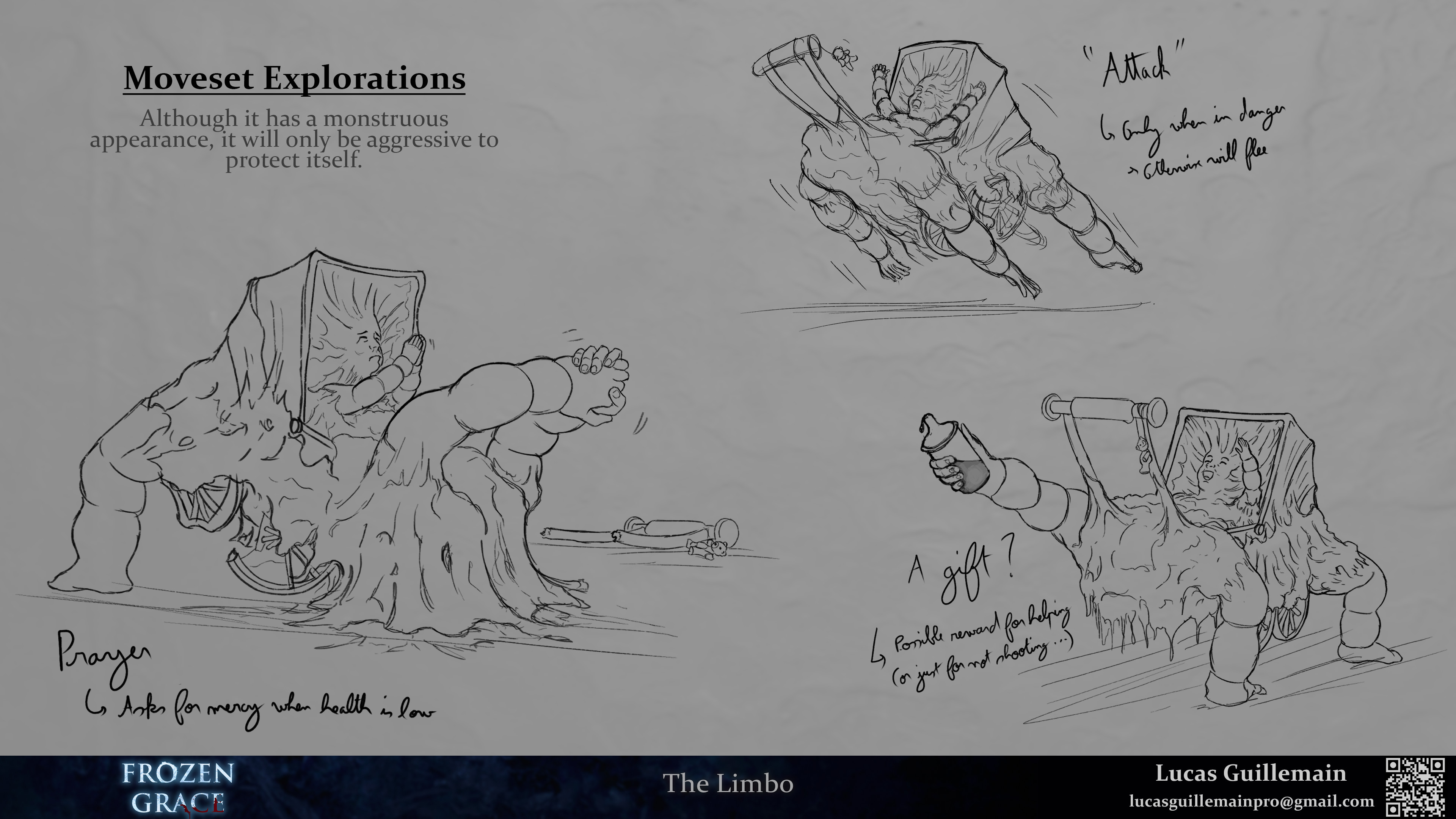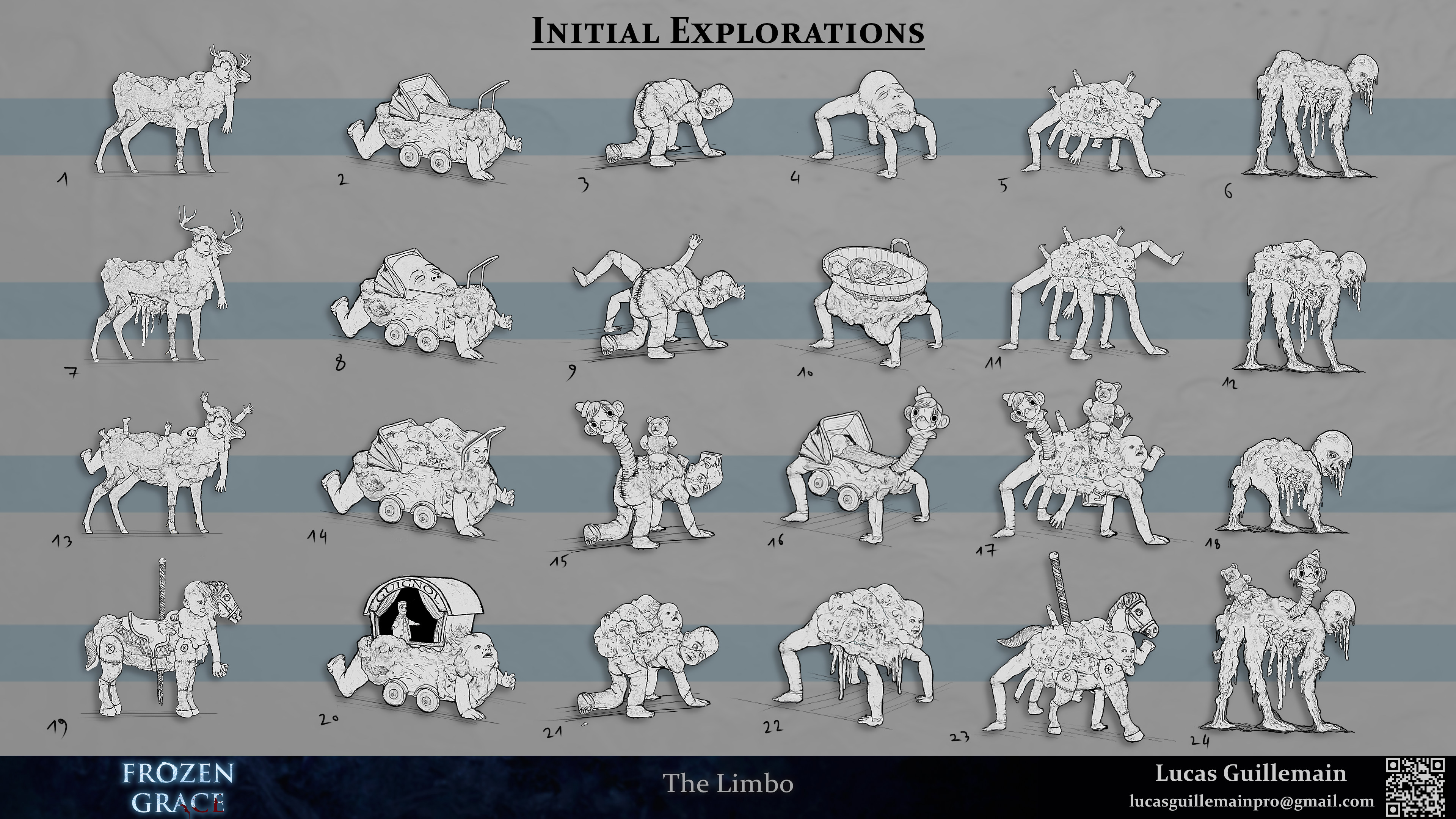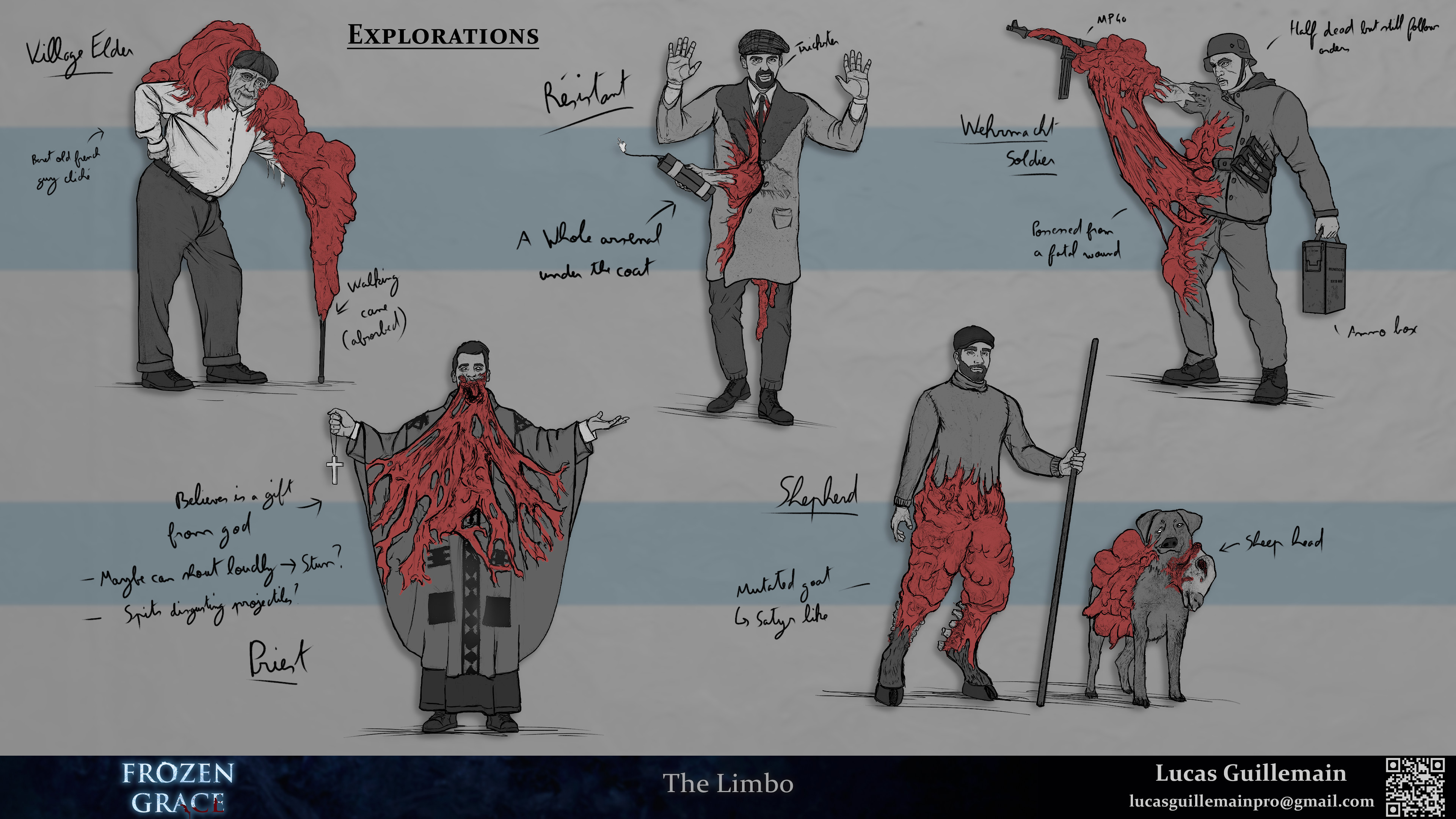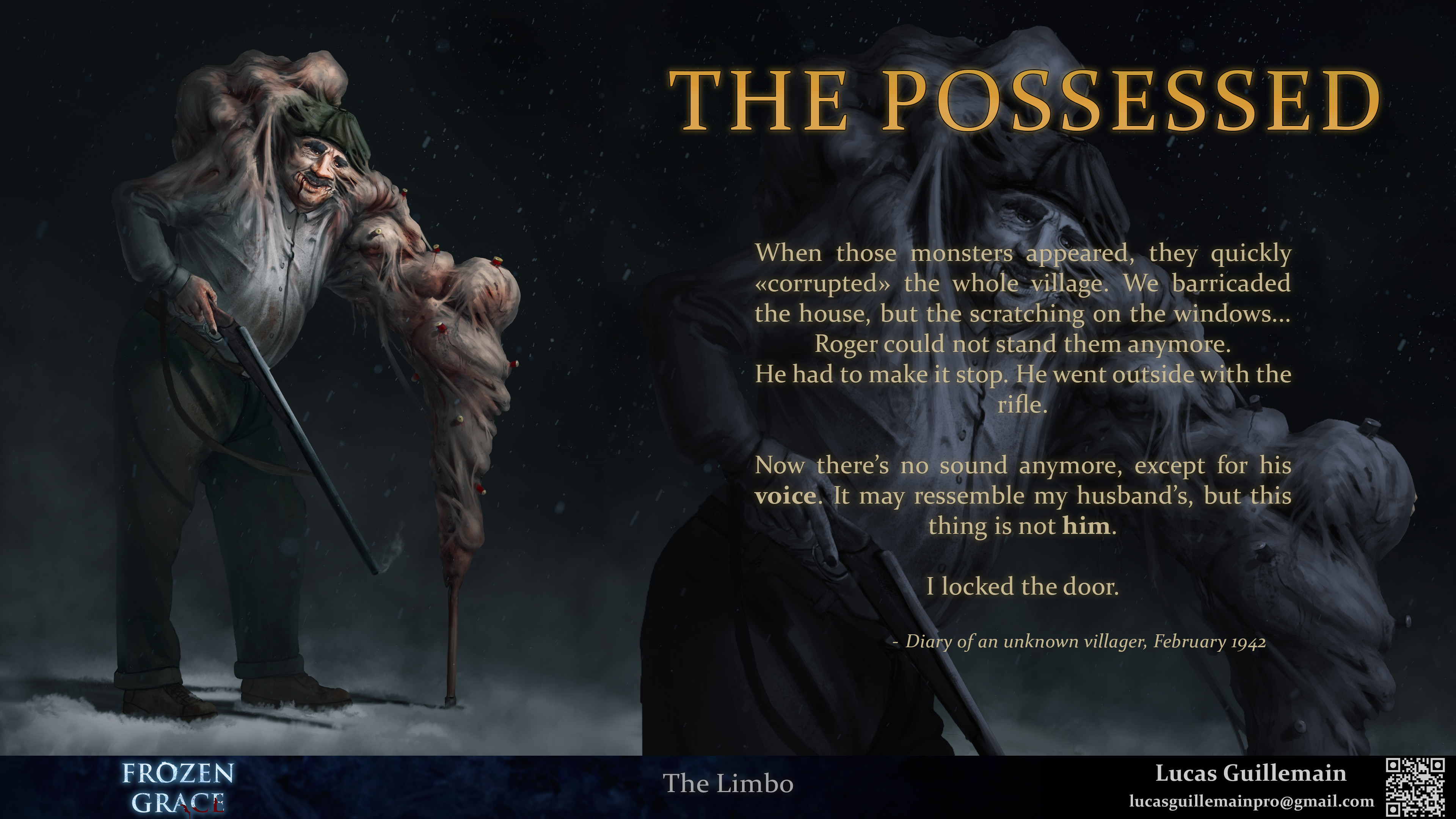 Frozen Grace is a fictional third person survival horror game set in occupied France in the winter of 1942. After the resistant made a strange ritual to curse the nazi occupants, a gate to hell opened in the village. You play as Lucienne, who's trying to find her husband after he went missing. Inspired by Orpheus myth and Dante's Divine Comedy, you have to go through the circles of hell to get back your lost love.